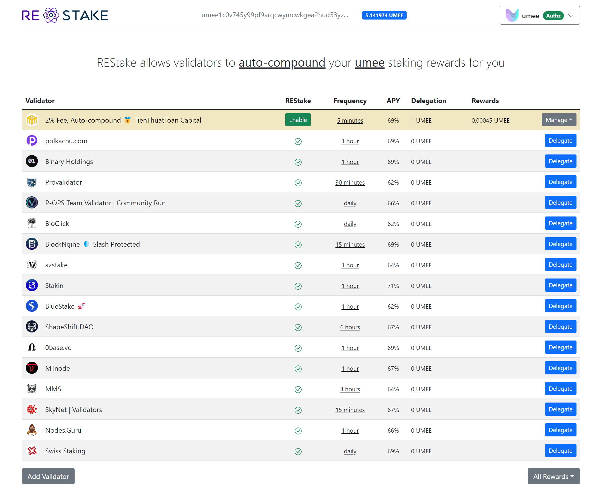 Danh sách 17 validator hiện tại đang hỗ trợ chức năng auto-compound của Cosmos SDK thông qua Authz, danh sách này được cập nhật hàng ngày.