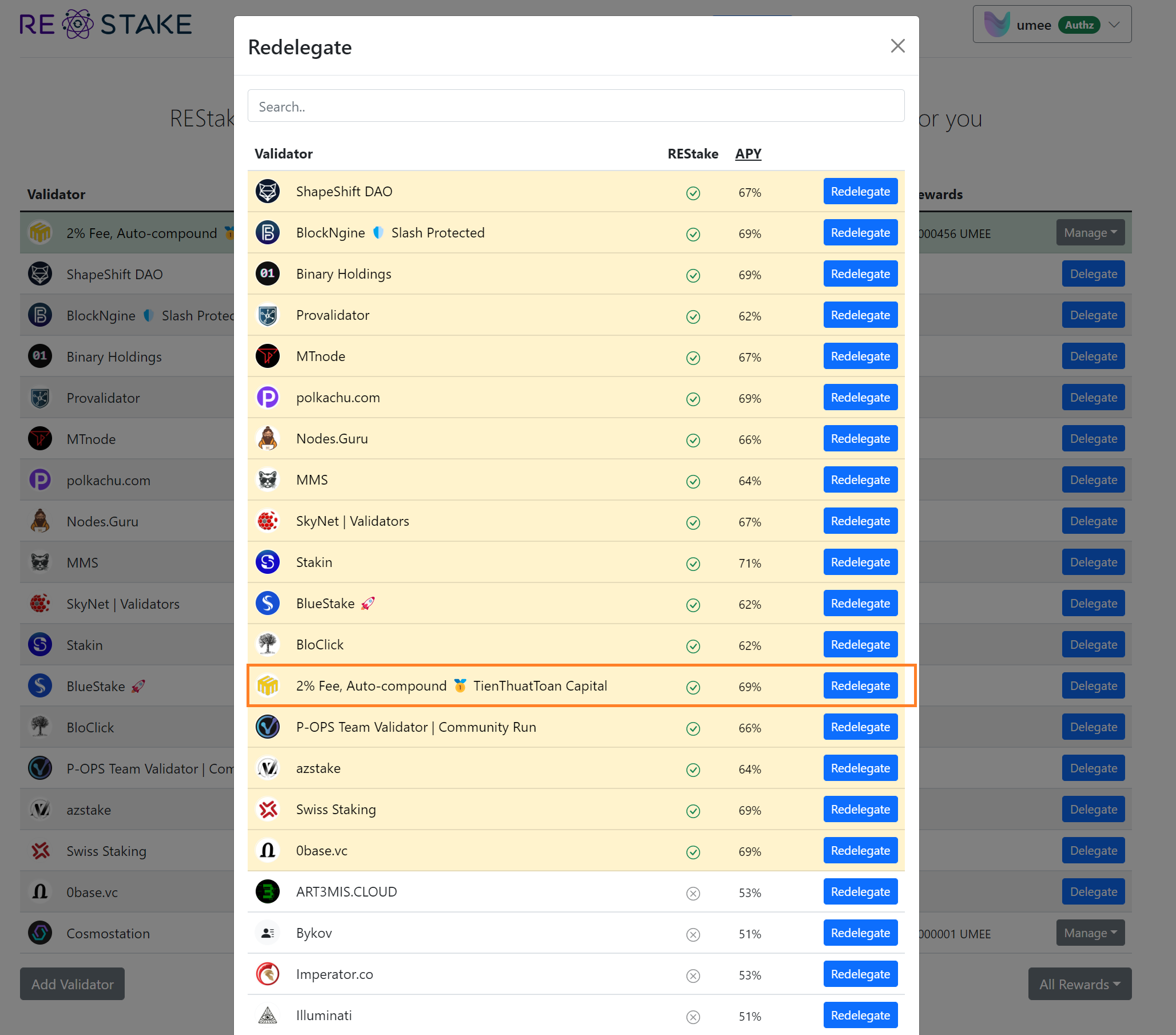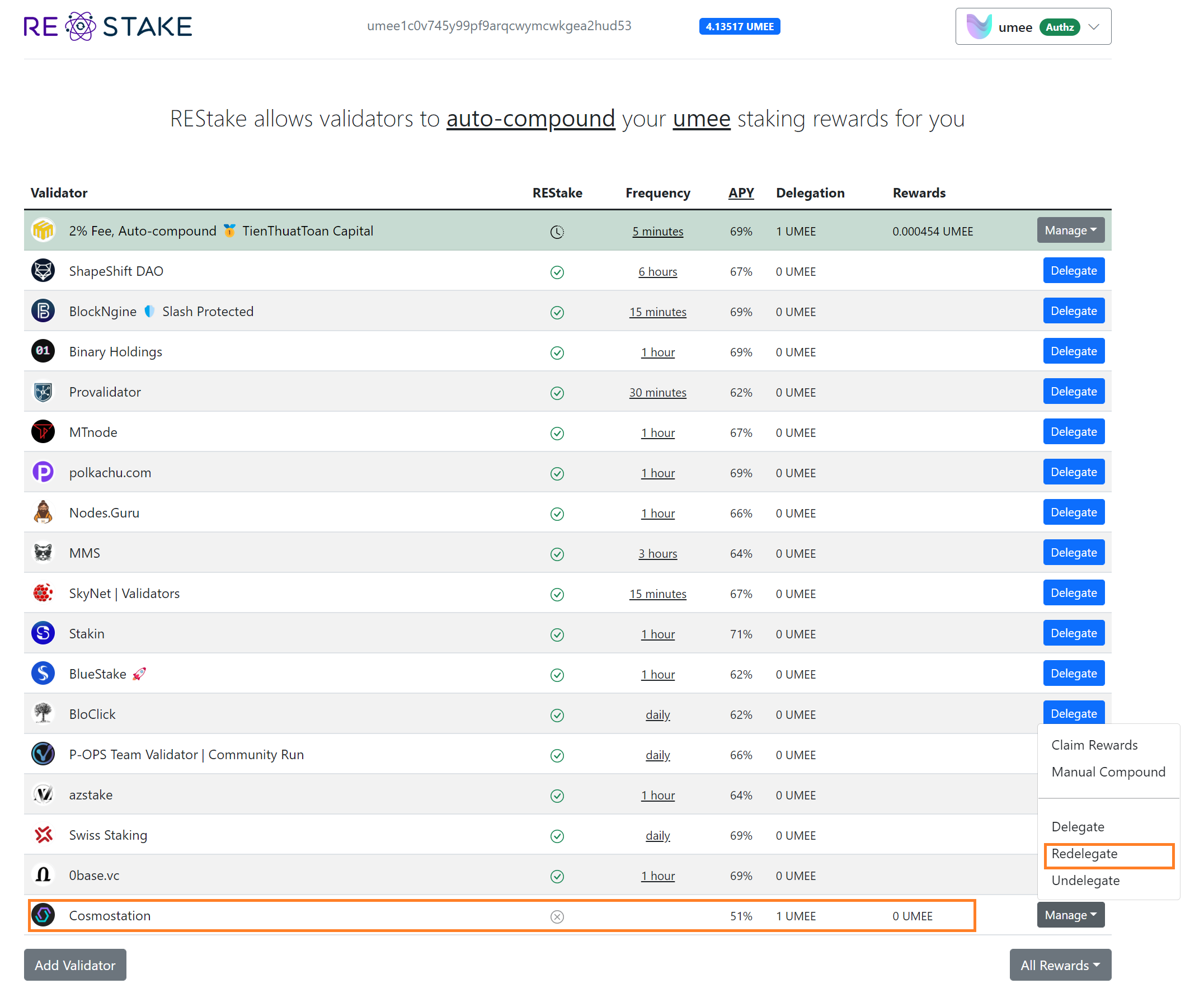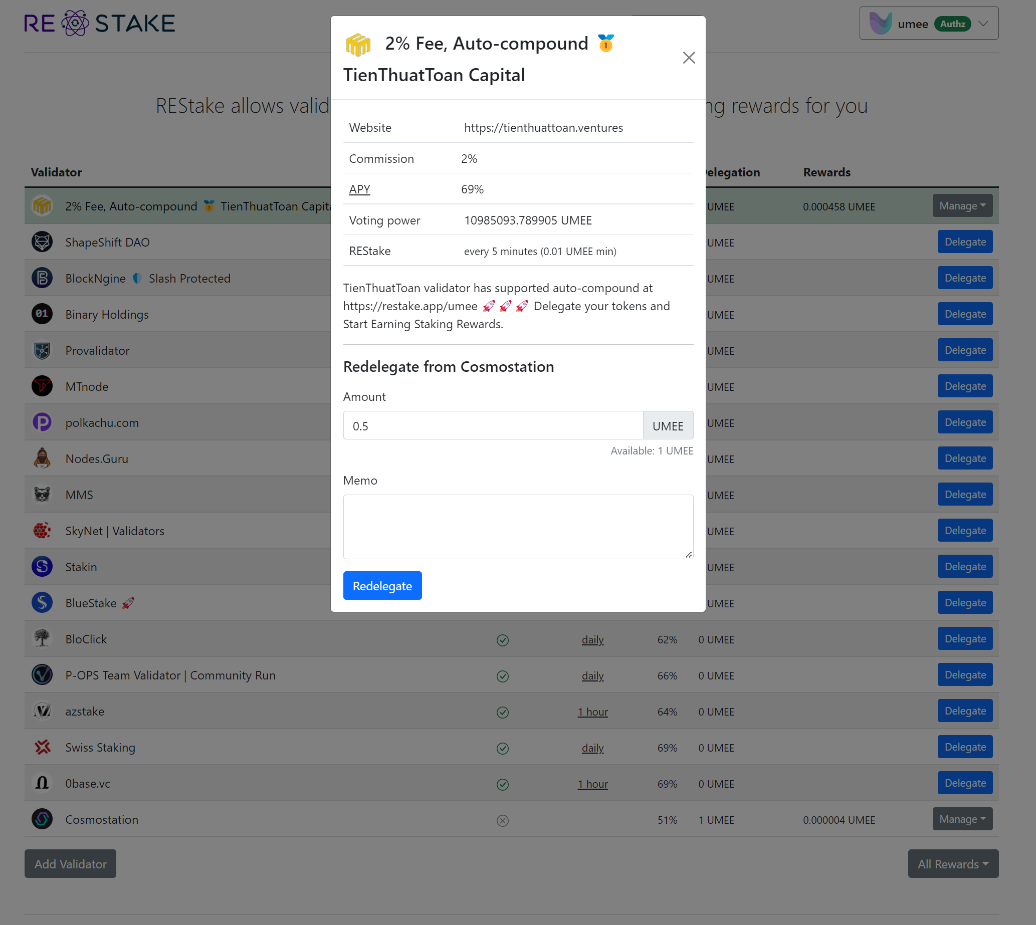 Chọn validator cần chuyển > Manage > Redelegate. Bạn có thể redelegate token từ một validator chưa hỗ trợ auto-compound sang một validator khác đang hỗ trợ auto-compound như validator Umee của TienThuatToan.