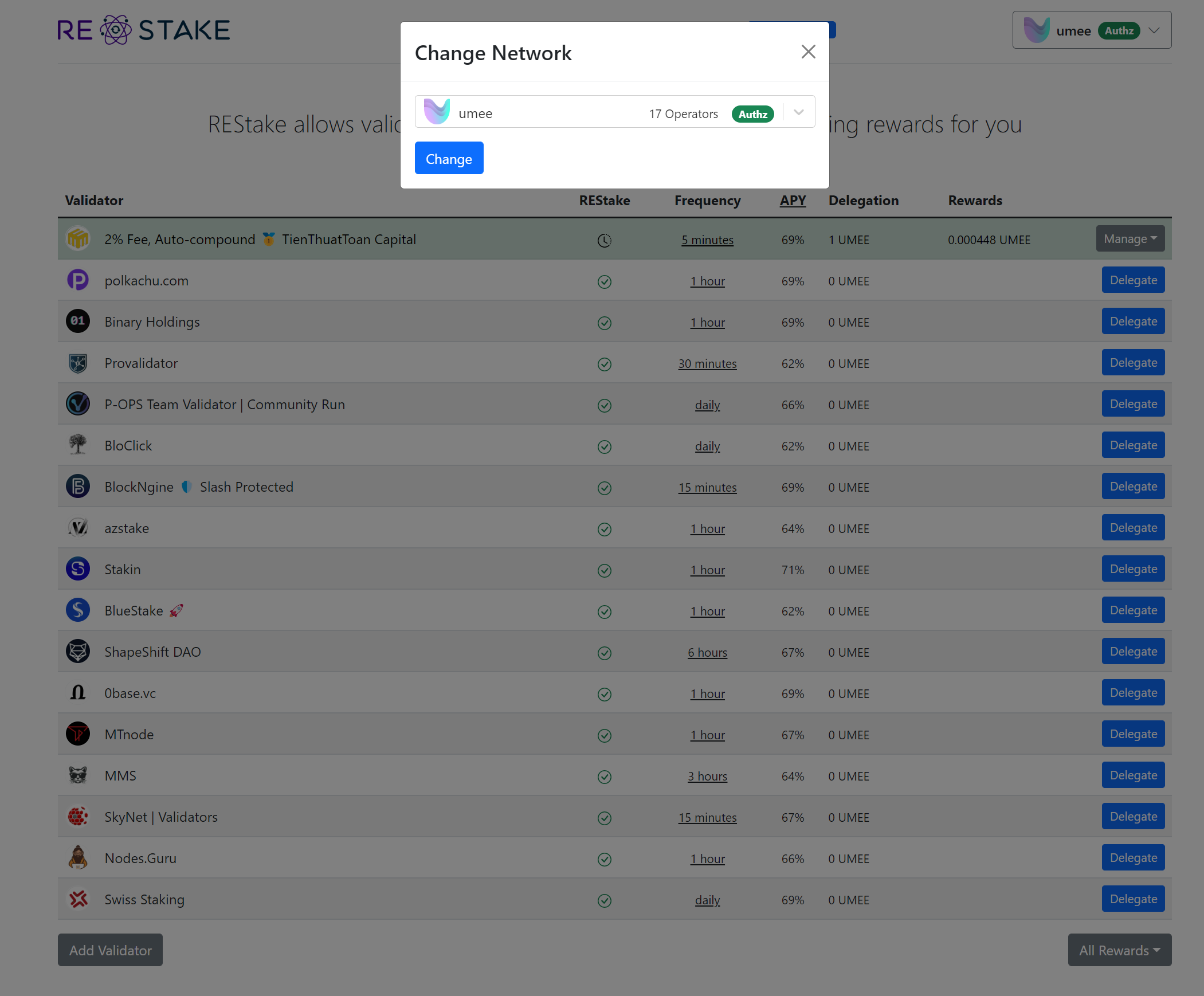 Bước 1: Vào https://restake.app. Kết nối ví Keplr với website. Chọn chain bạn đang stake. Ở bài này, mình lấy ví dụ chain Umee.