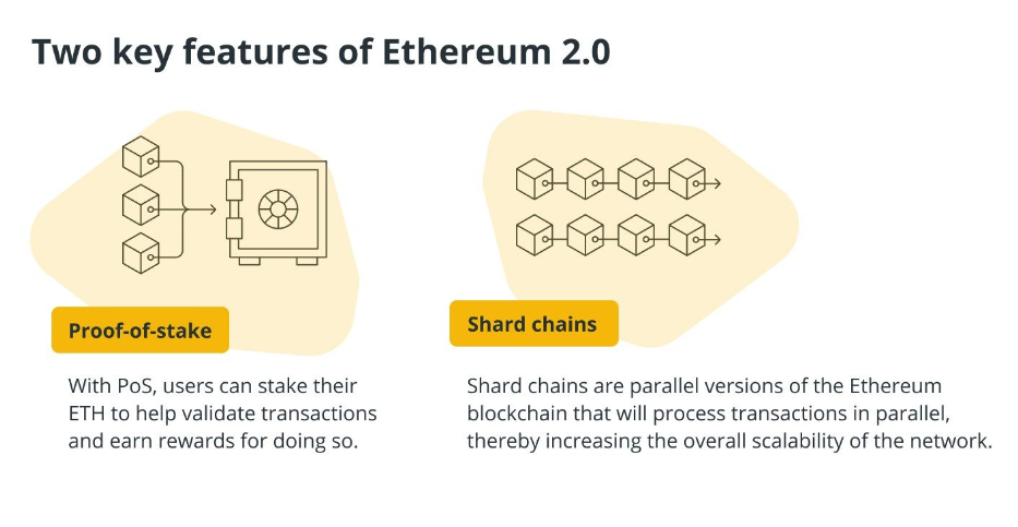 Một trong những tính năng chính của Ethereum 2.0 là sharding, cho phép chia nhỏ khối lượng công việc để xử lý các yêu cầu giao dịch song song. Ngoài ra, bản cập nhật Ethereum 2.0 sẽ sử dụng đồng thuận PoS thay vì PoW khi xác thực các giao dịch và khối.