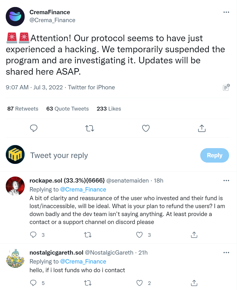 Crema Finance tham gia vào danh sách các giao thức bị tấn công trên blockchain Solana. Vào đầu giờ ngày 3 tháng 7, Liquidity Protocol đã thông báo cho người dùng trên Twitter rằng họ đã tạm ngừng mọi hoạt động trên mạng do vụ hack.