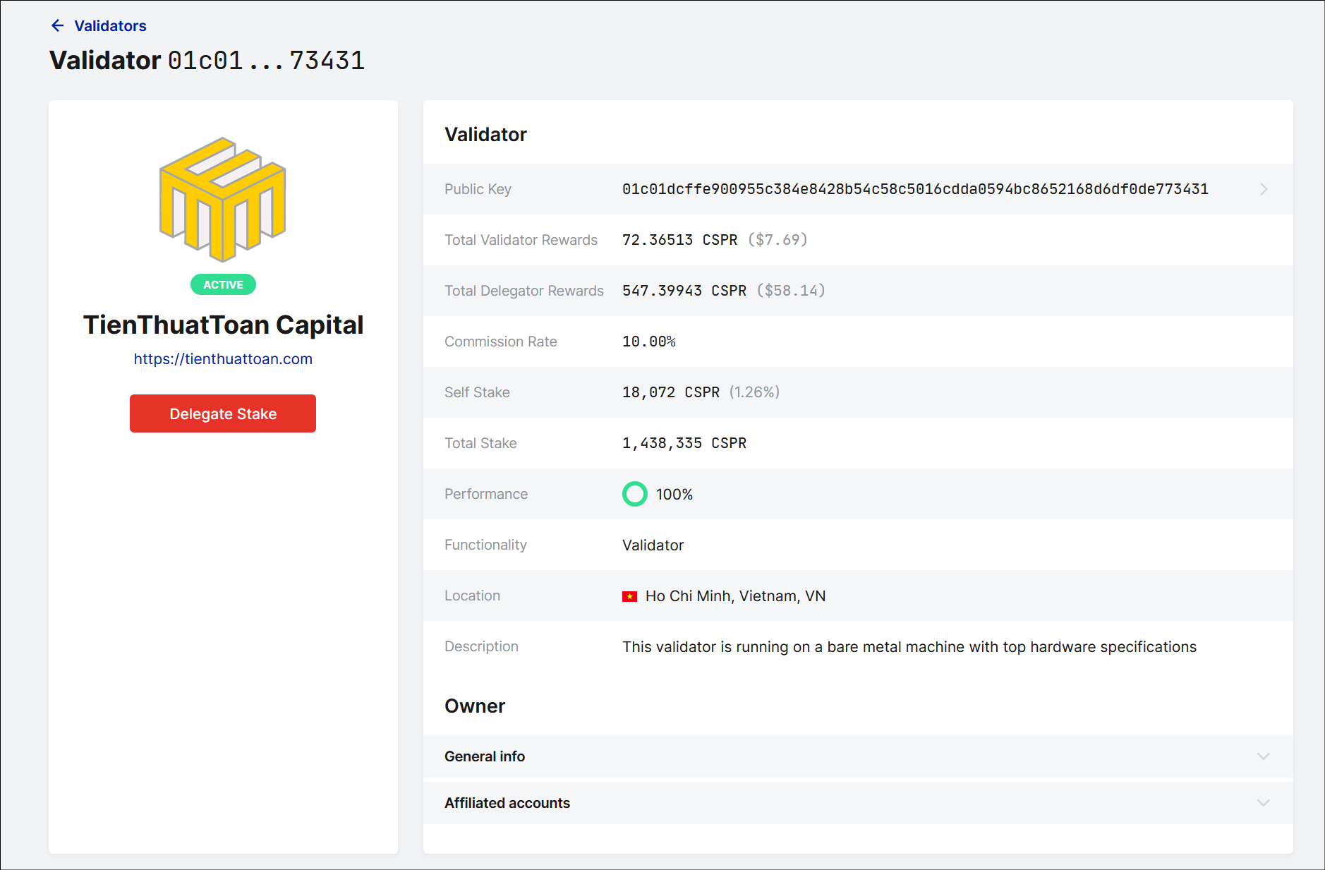 Ngoài Casperstat ra, trình explorer khác của Casper Network là Cspr Live, hai trình này sử dụng tương tự nhau. Bạn có thể sử dụng ví Casper Vault để stake CSPR trên đó. Node TienThuatToan Capital có tick xanh trên cả 2 trình explorer. Xem thông tin node tại Casperstats và Cspr Live.