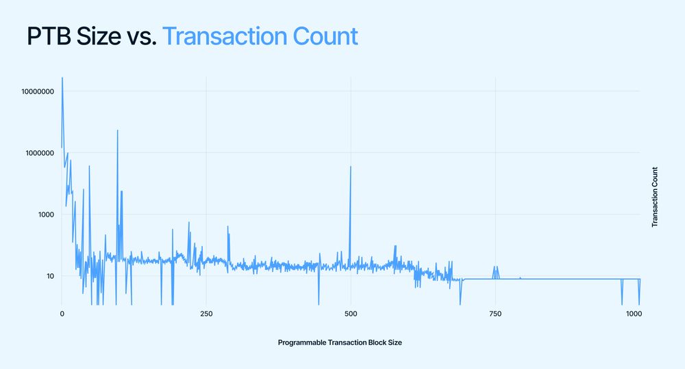 Do sự tiện lợi và sức mạnh của Khối giao dịch có thể lập trình, các nhà phát triển trên Sui đang xây dựng Khối giao dịch có thể lập trình ngày càng tinh vi được tùy chỉnh cho các ứng dụng của họ. Khả năng lập trình của Sui có tính biểu cảm cao ngay cả trước PTB, nhưng giờ đây, một lần thực thi duy nhất có thể thực hiện tới 1024 hoạt động không đồng nhất, mỗi hoạt động đó sẽ là một giao dịch riêng lẻ trên hầu hết các chuỗi khối khác. Mặc dù tính năng này mới chỉ xuất hiện trên Sui public Testnet được khoảng một tháng, nhưng các nhà phát triển Sui đã khám phá nhiều kích cỡ PTB khác nhau, thậm chí trong phạm vi 500 – 1000 (ví dụ 1, ví dụ 2, ví dụ 3). Biểu đồ sau minh họa sự phân bổ Kích thước PTB hiện tại trên Testnet: