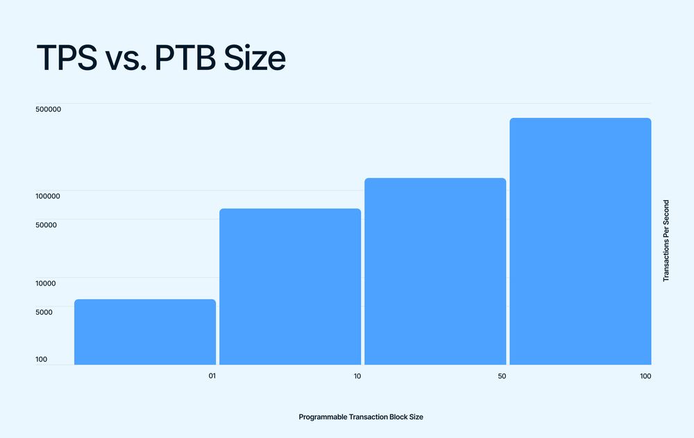 Mỗi PTB hỗ trợ tới 1024 giao dịch, mang lại cả tính biểu cảm và hiệu quả không giới hạn. PTB có thể được sử dụng cho cả việc phân nhóm đồng nhất (ví dụ: để thanh toán hoặc đúc NFT) và chuỗi hoạt động không đồng nhất của một người gửi như hai ví dụ trên. Cả hai chế độ đều tận dụng khả năng thực thi tốc độ cao của Sui và cho phép người dùng đẩy mức phí giao dịch vốn đã thấp xuống thấp hơn nữa bằng cách gói gọn công việc hiệu quả hơn vào một PTB duy nhất.