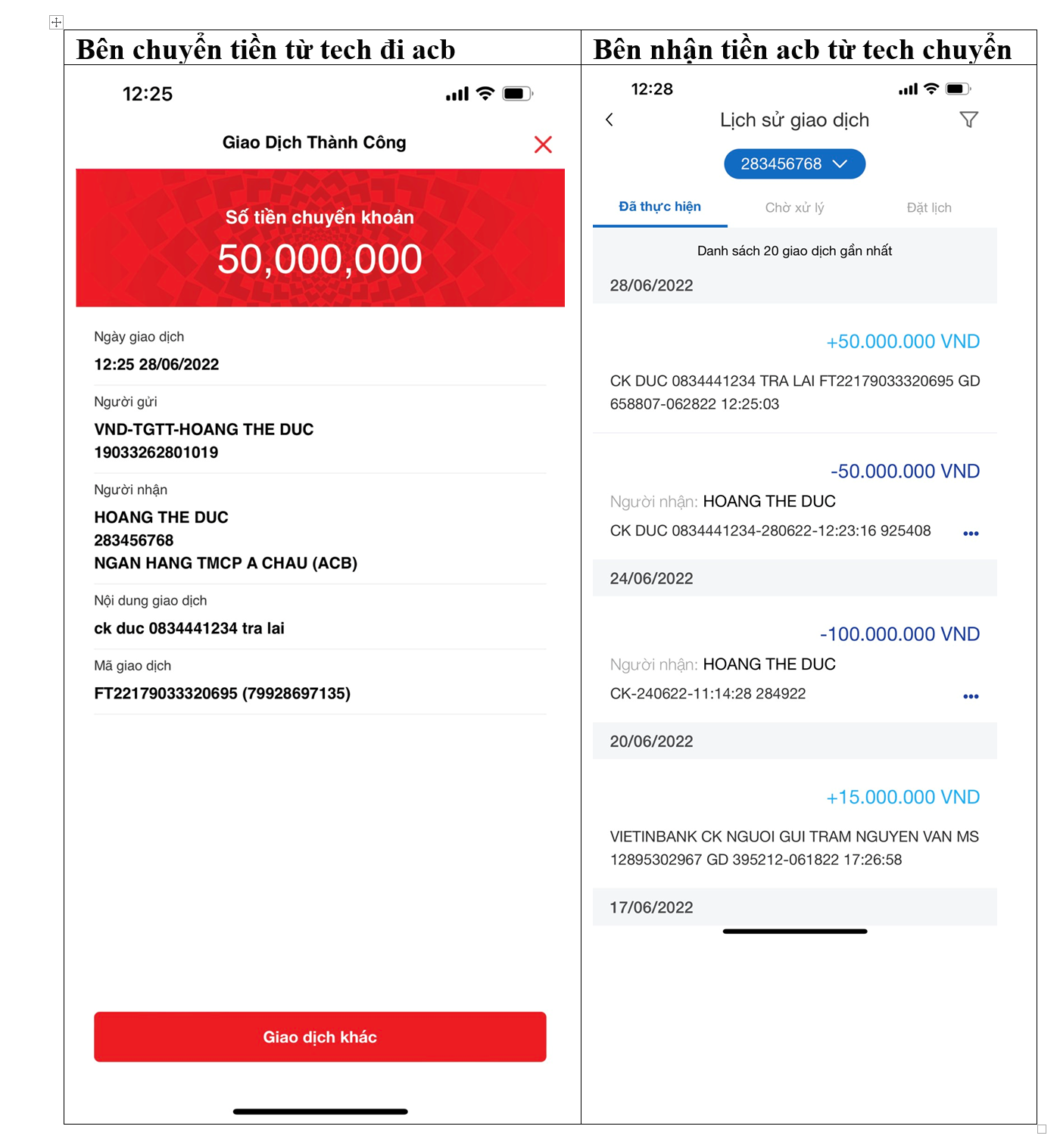 Ví dụ 2: Đơn ck tiền liên ngân hàng (24/7) từ ACB đến Techcombank trị giá 50 triệu vnđ