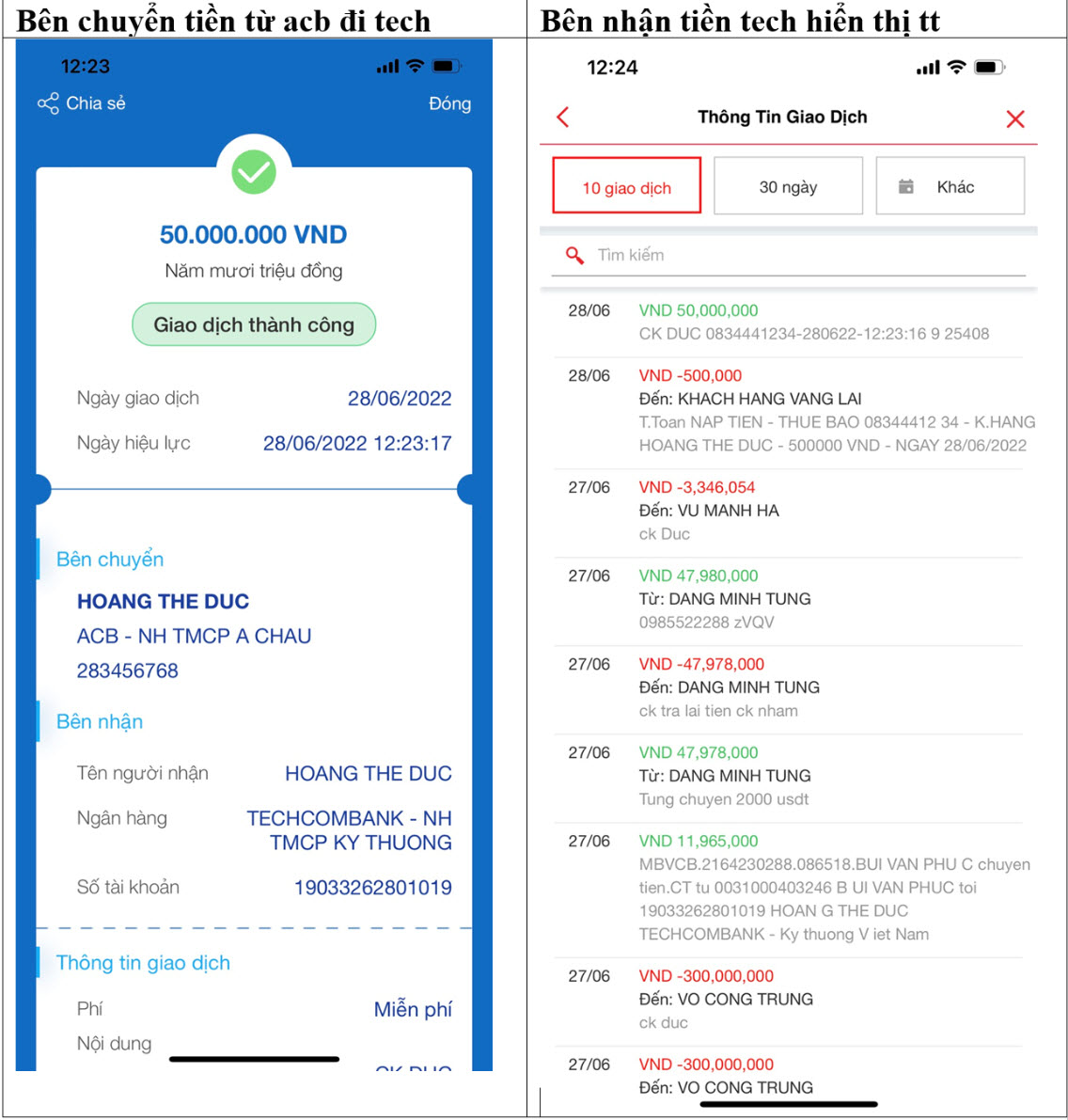 Ví dụ 1: Đơn ck tiền liên ngân hàng (24/7) từ techcombank đến ACB trị giá 50 triệu vnđ