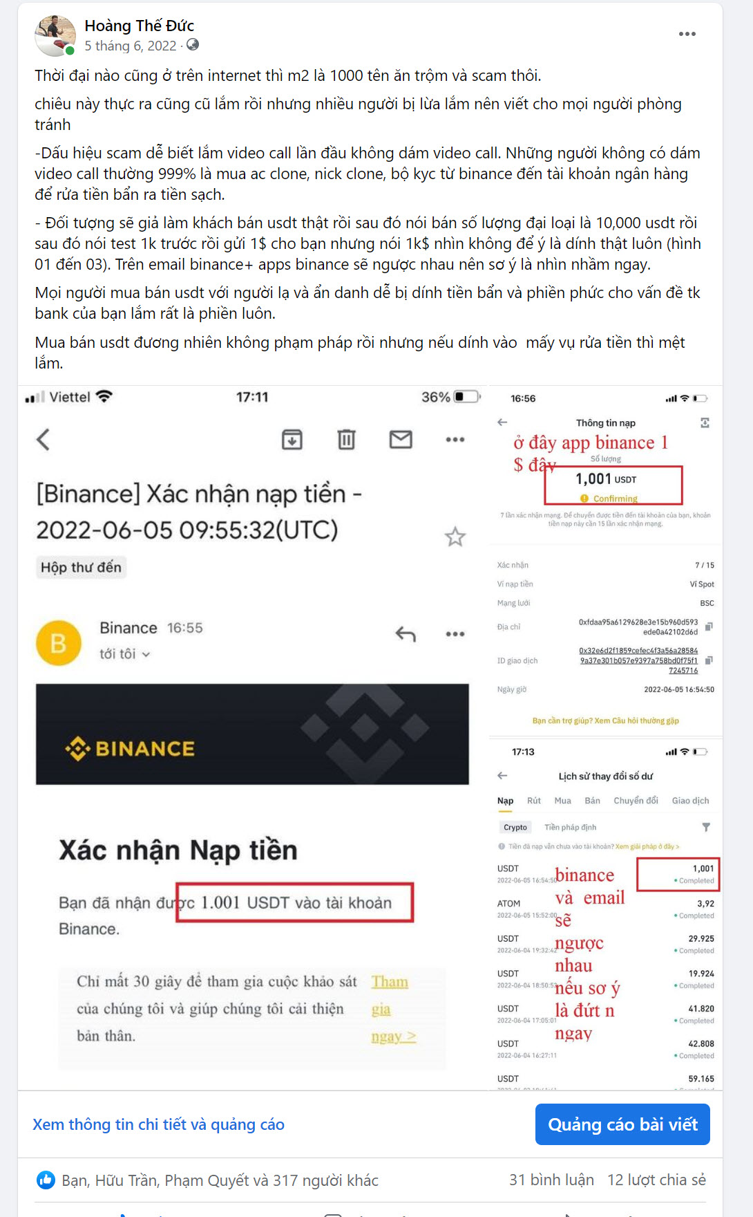 – Scam thường sẽ tạo 1 quảng cáo mua, khi bạn chủ động bán cho scam thì nó sẽ giữ lệnh của bạn lại. Rồi nó sẻ giả làm nhân viên hỗ trợ của sàn (Cài đặt hình đại diện giống sàn Binance) gọi điện, nhắn tin cho bạn đề nghị giúp đỡ bạn. Yêu cầu bạn cung cấp thông tin đăng nhập hay quét mã QR, nếu bạn làm theo thì Scam sẽ đăng nhập được vào tài khoản của bạn rút hết coin.